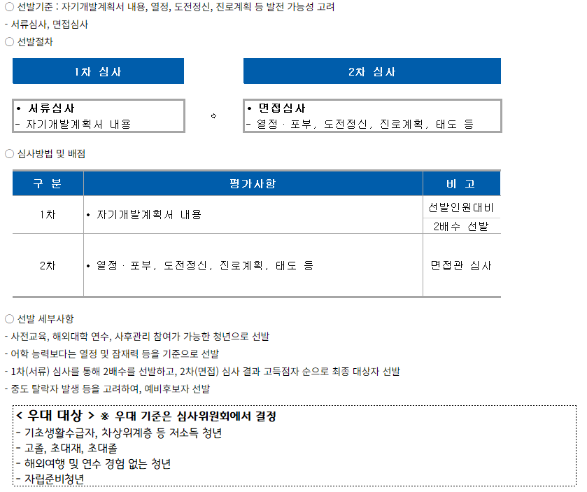 선발 방법은 자기계발 계획서 내용과 열정, 도전정신, 진로계획 등 발전 가능성을 고려하여