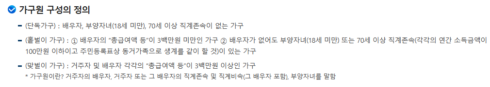 - 신청자격 중소득요건(가구 유형별 기준금액) 판정기준
